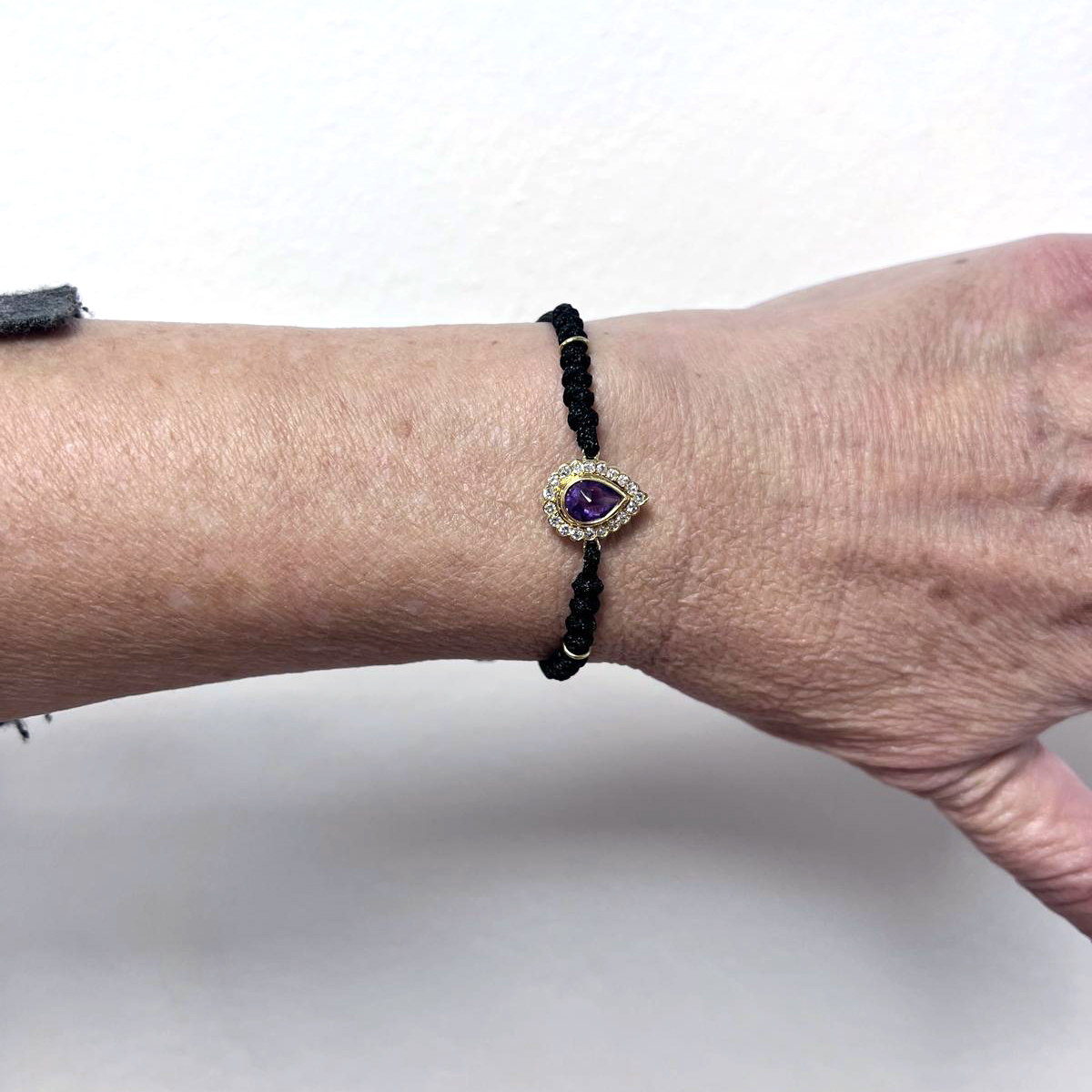 Pulsera de Oro Amarillo con Diamantes naturales y Amatista para mujer | 19x Diamantes naturales en talla Brillante con peso de 0,60 cts y 1x Amatista brasileña en talla Pera de 9x7mm | Oro Amarillo 18K | 3,52 gramos | Cierre corredero en cordón negro | Medidas centro gota 15mm x 12mm | Producto nuevo a estrenar solo disponible en la web | Ref: UKA000078GM