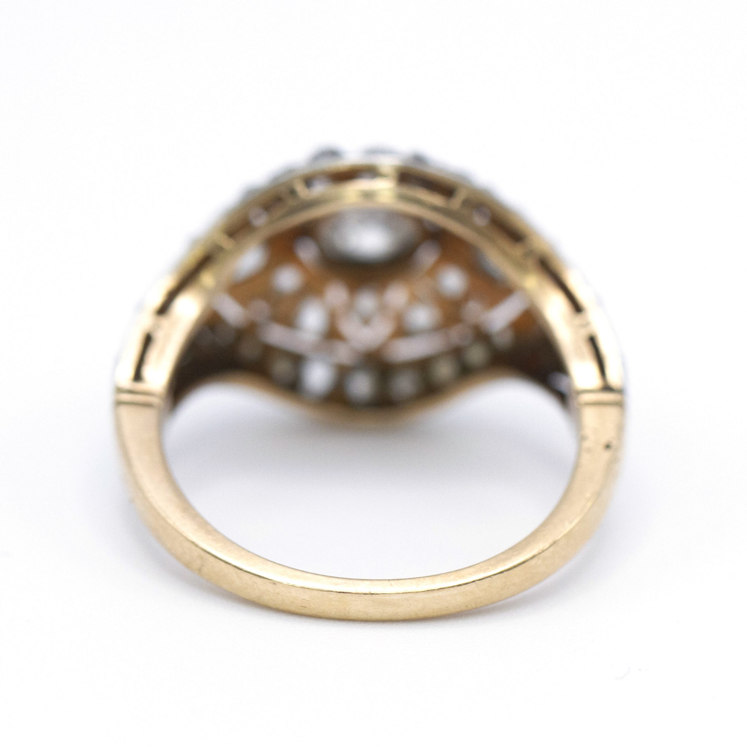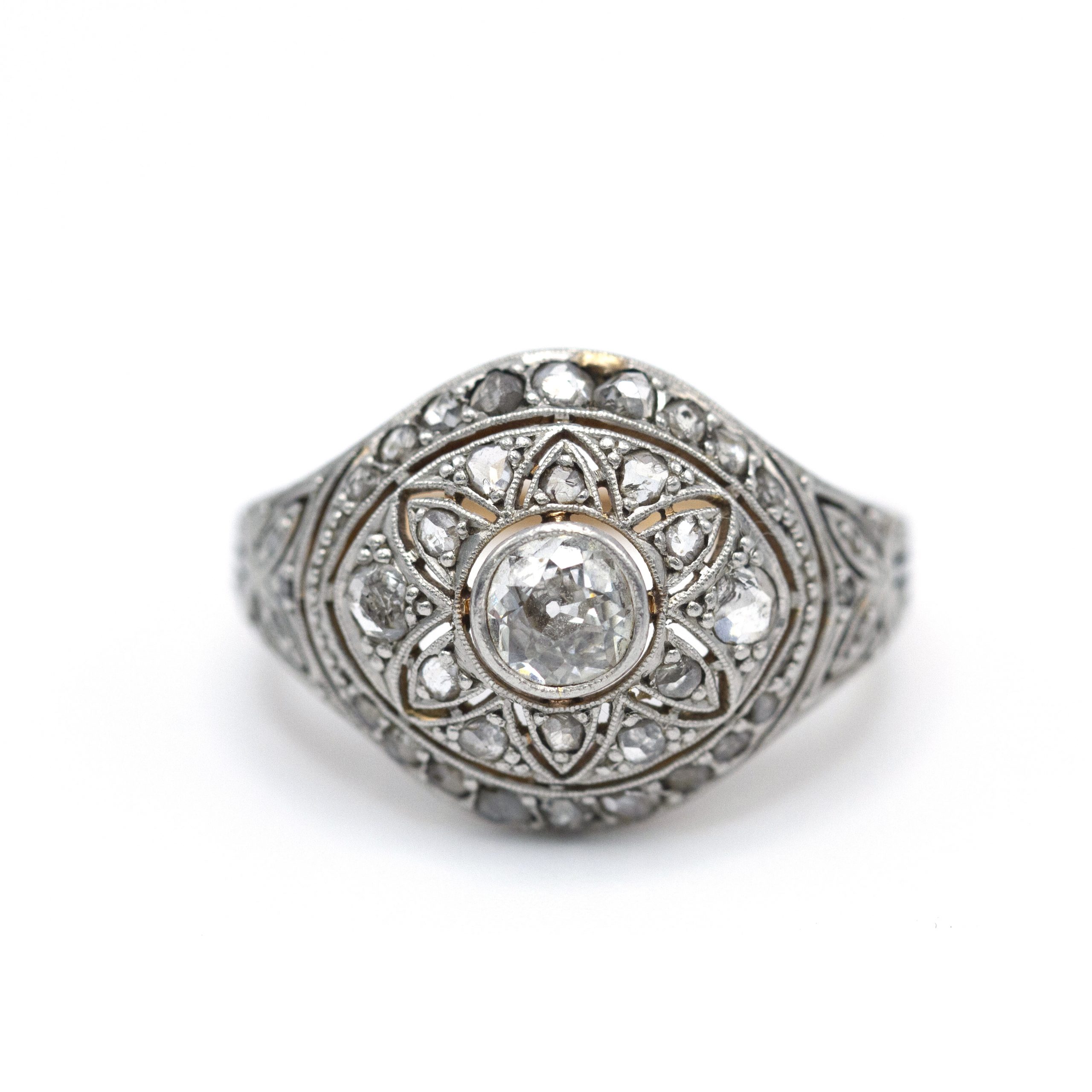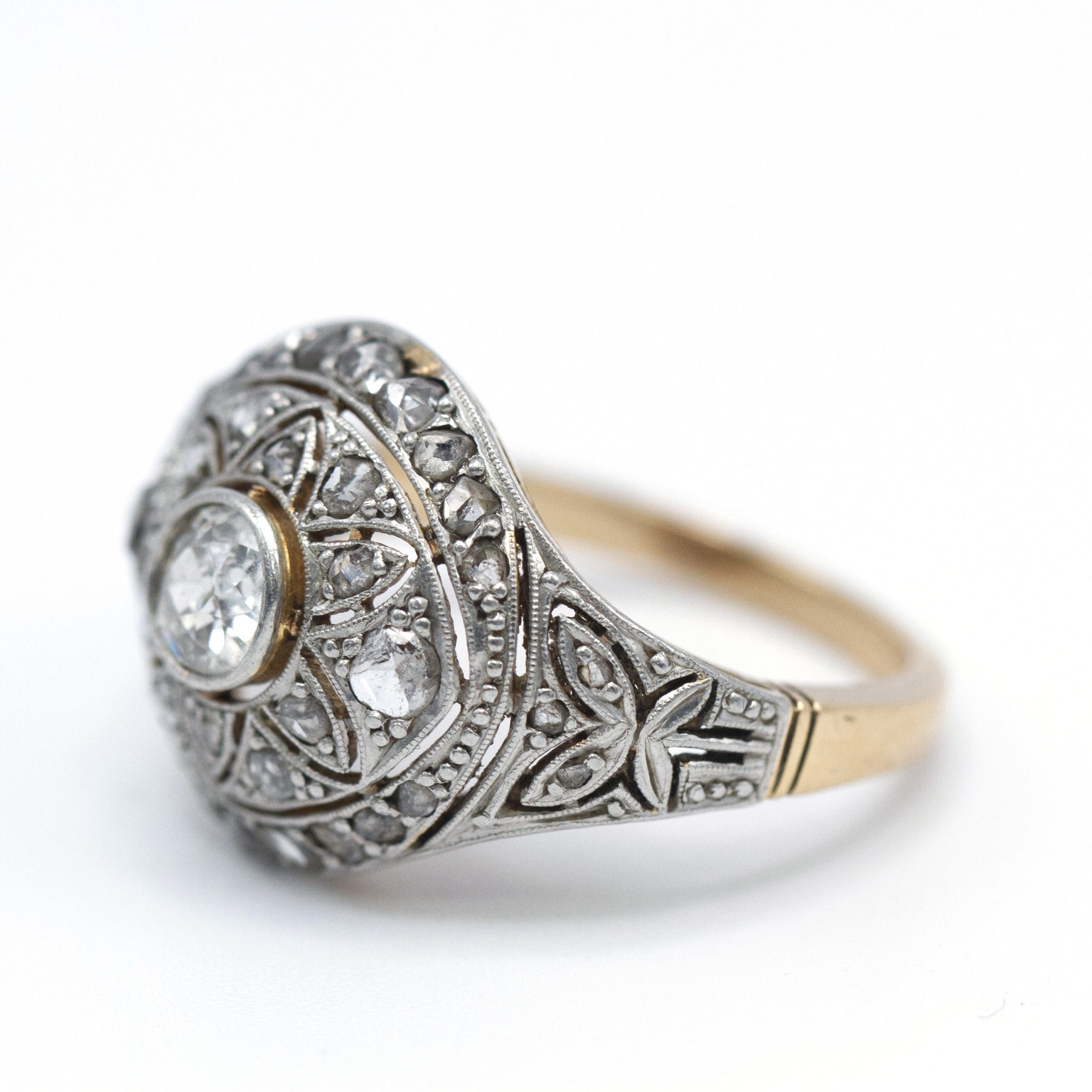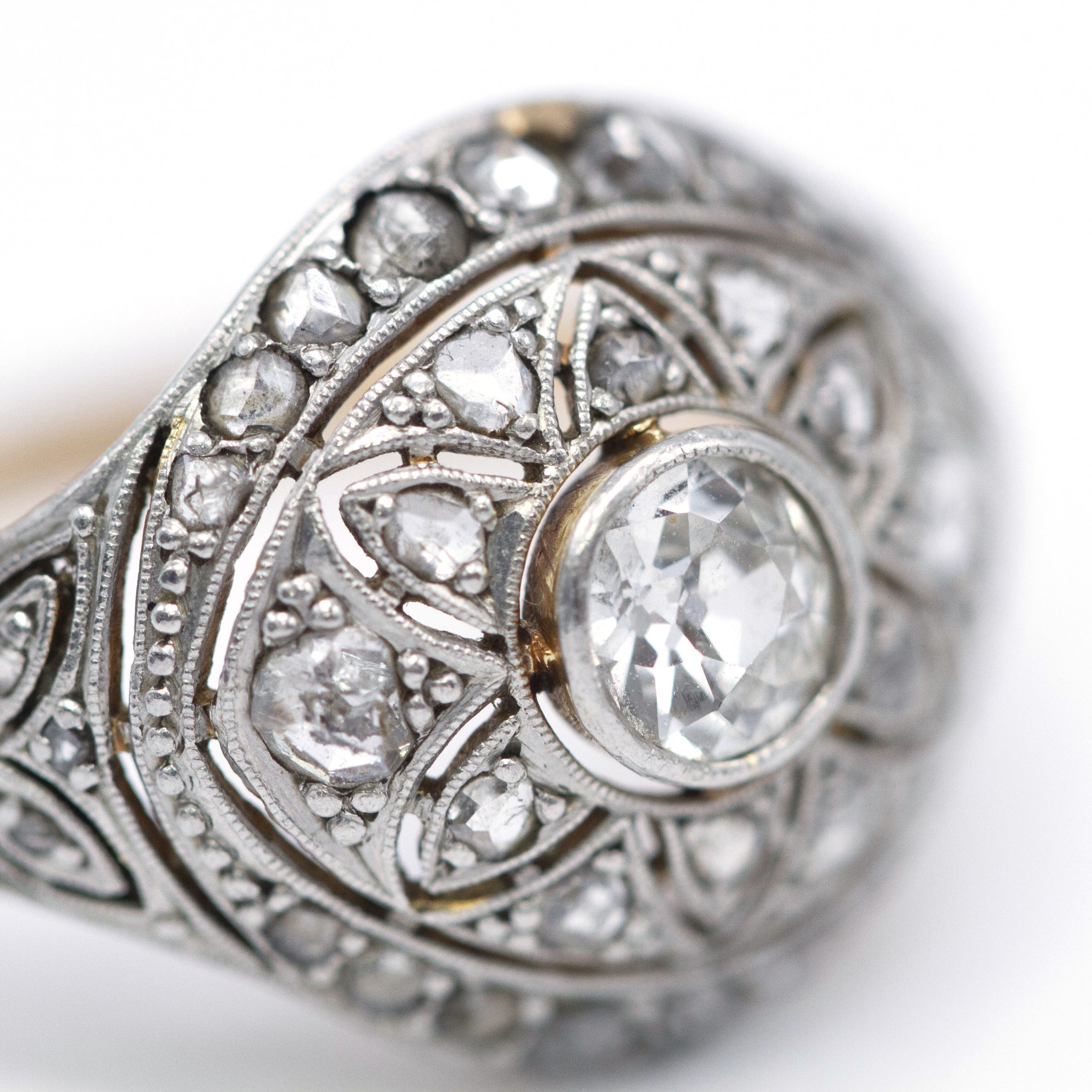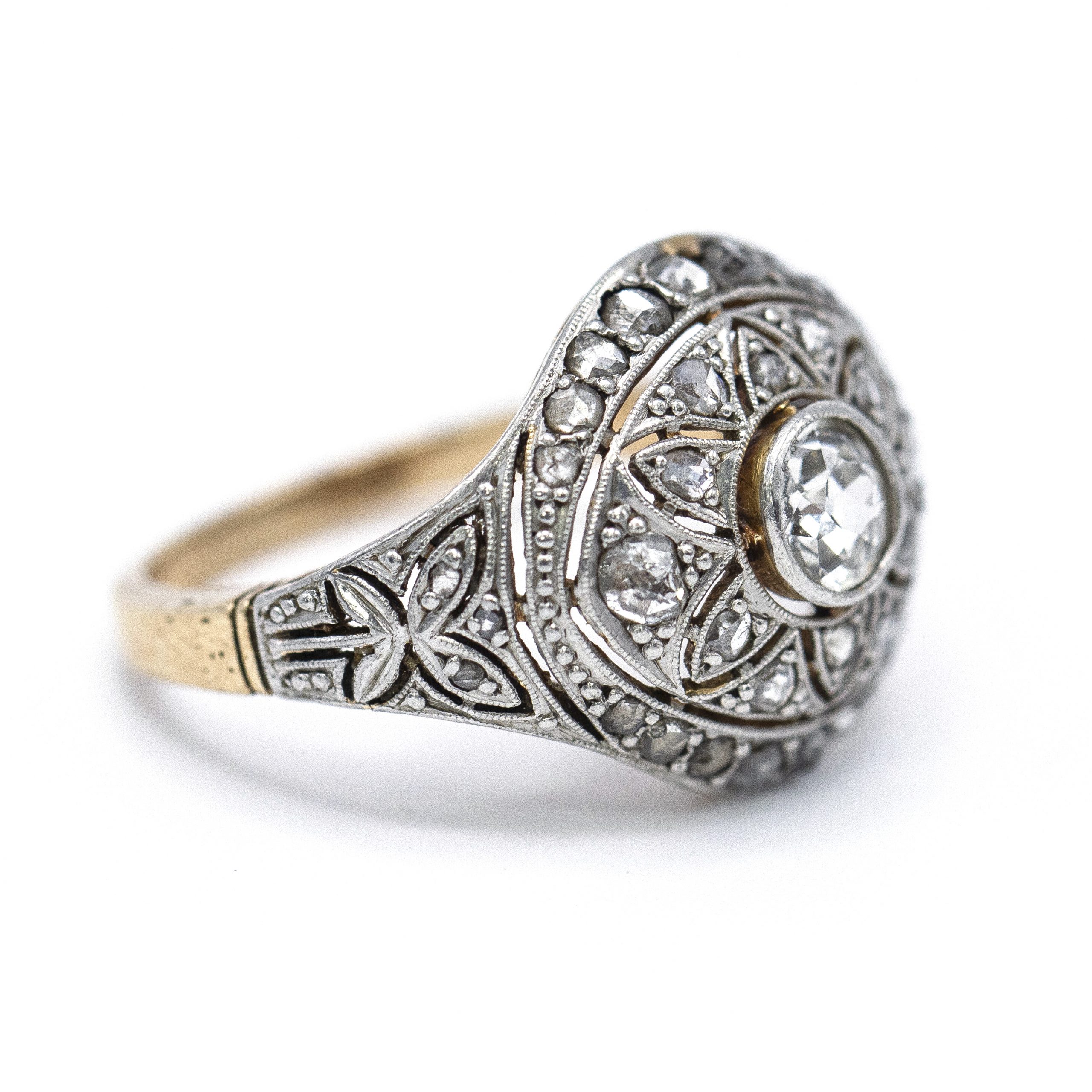 Anillo de época bicolor para mujer | Diamantes en talla antigua con peso total aprox. de 0,55ct en calidad H/Si | Talla 18, no se recomienda modificar la talla (aún y asi, consultar presupuesto) | Oro Amarillo y Oro Blanco 18K | 5,30 gramos. | Producto original antiguo de segunda mano. Este anillo se encuentra en buen estado de conservación con evidentes signos de uso | Ref.: UKA000074PV