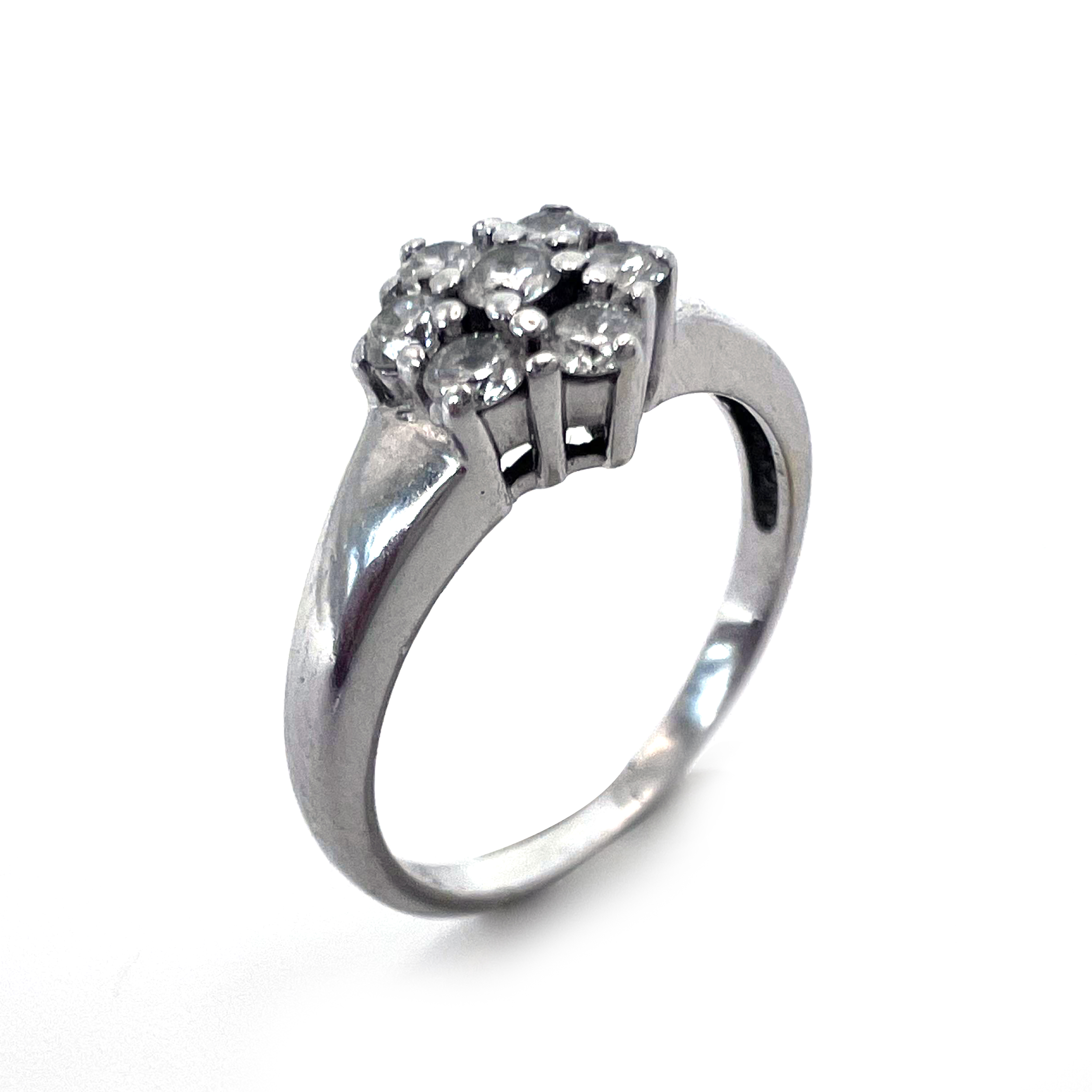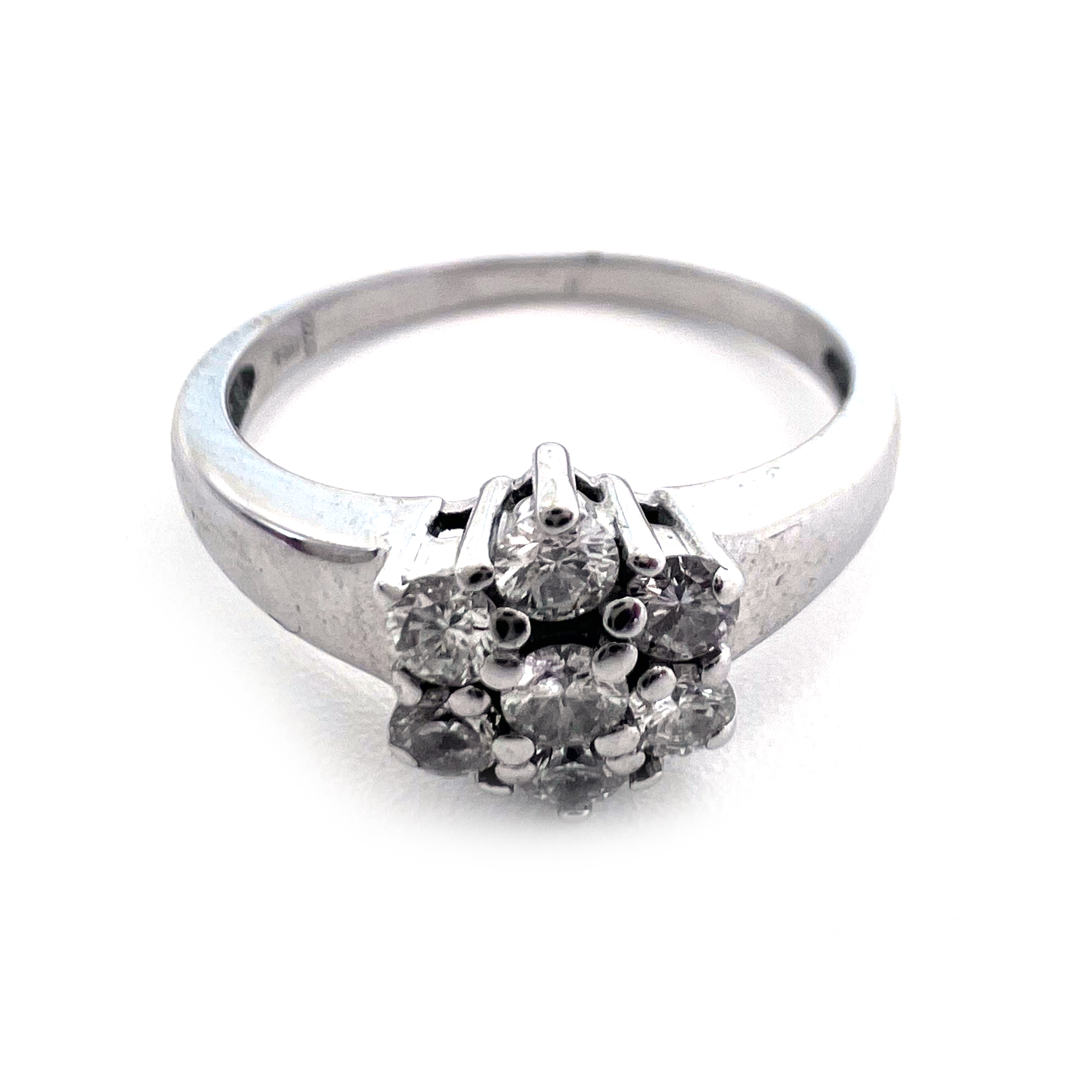 Anillo de oro Blanco rosetón de Diamantes para mujer | 7x Brillantes con peso total aproximado de 0.40 cts | Talla 11.5 | Oro Blanco 18K | 2.7 gramos. | Medidas: 4.8 mm de grosor y 7.9 de ancho máximo. Se puede adaptar desde la talla 10 a la 17 (consultar presupuesto). | Este anillo se encuentra en excelente estado de conservación, sin ningún desgaste de uso visible. | Ref UKA000003RN