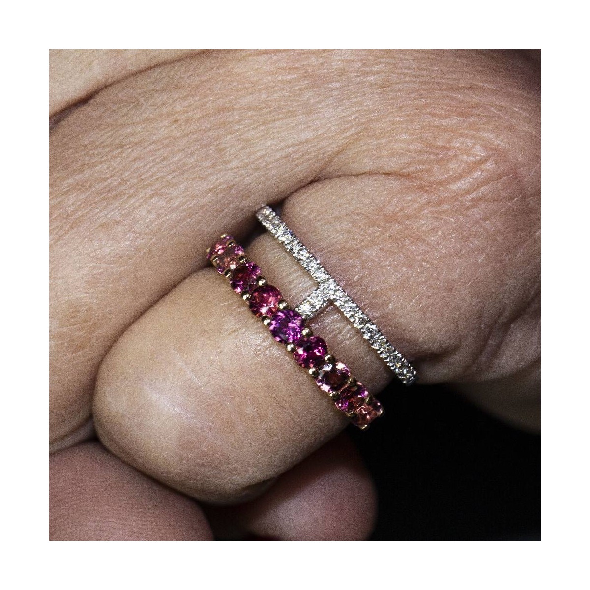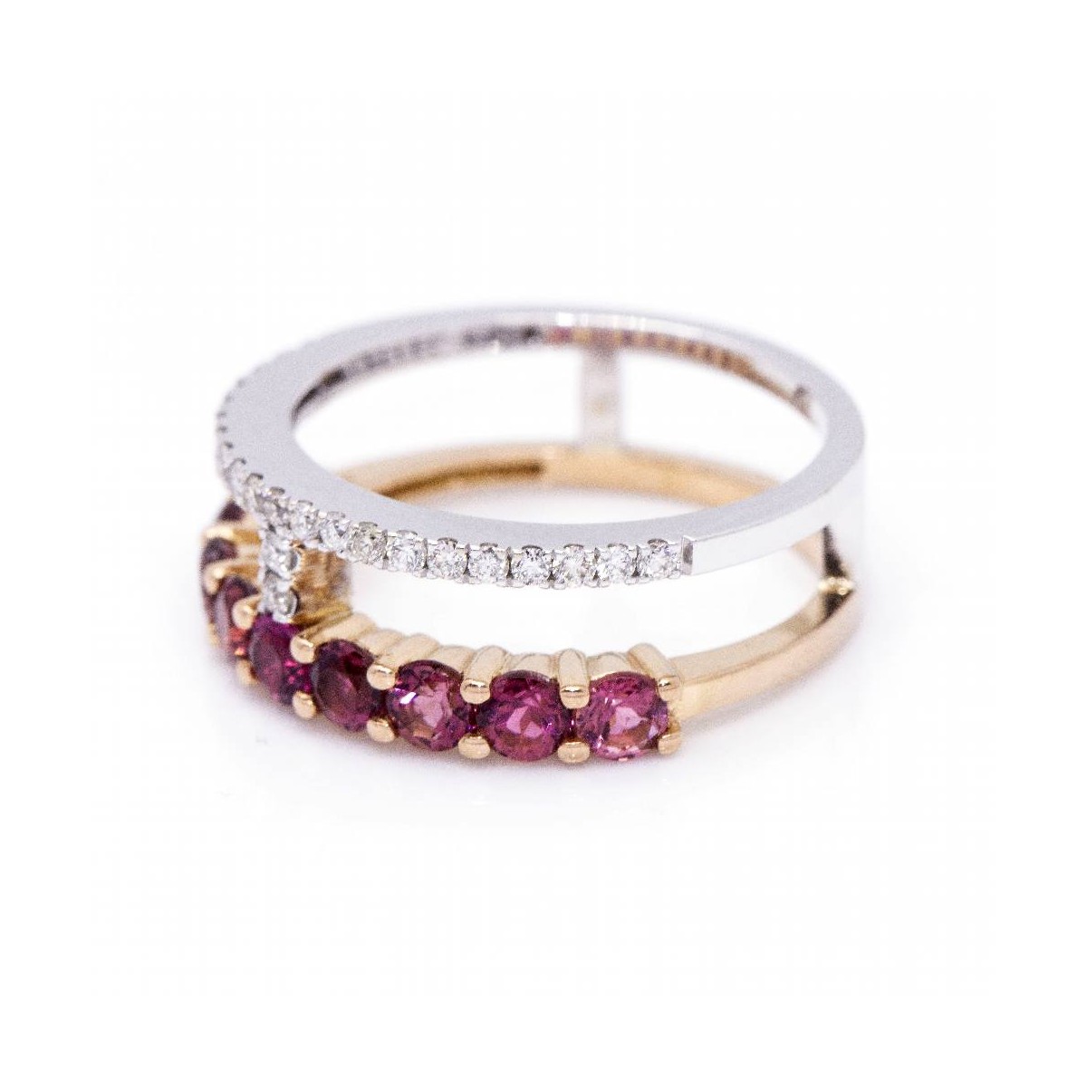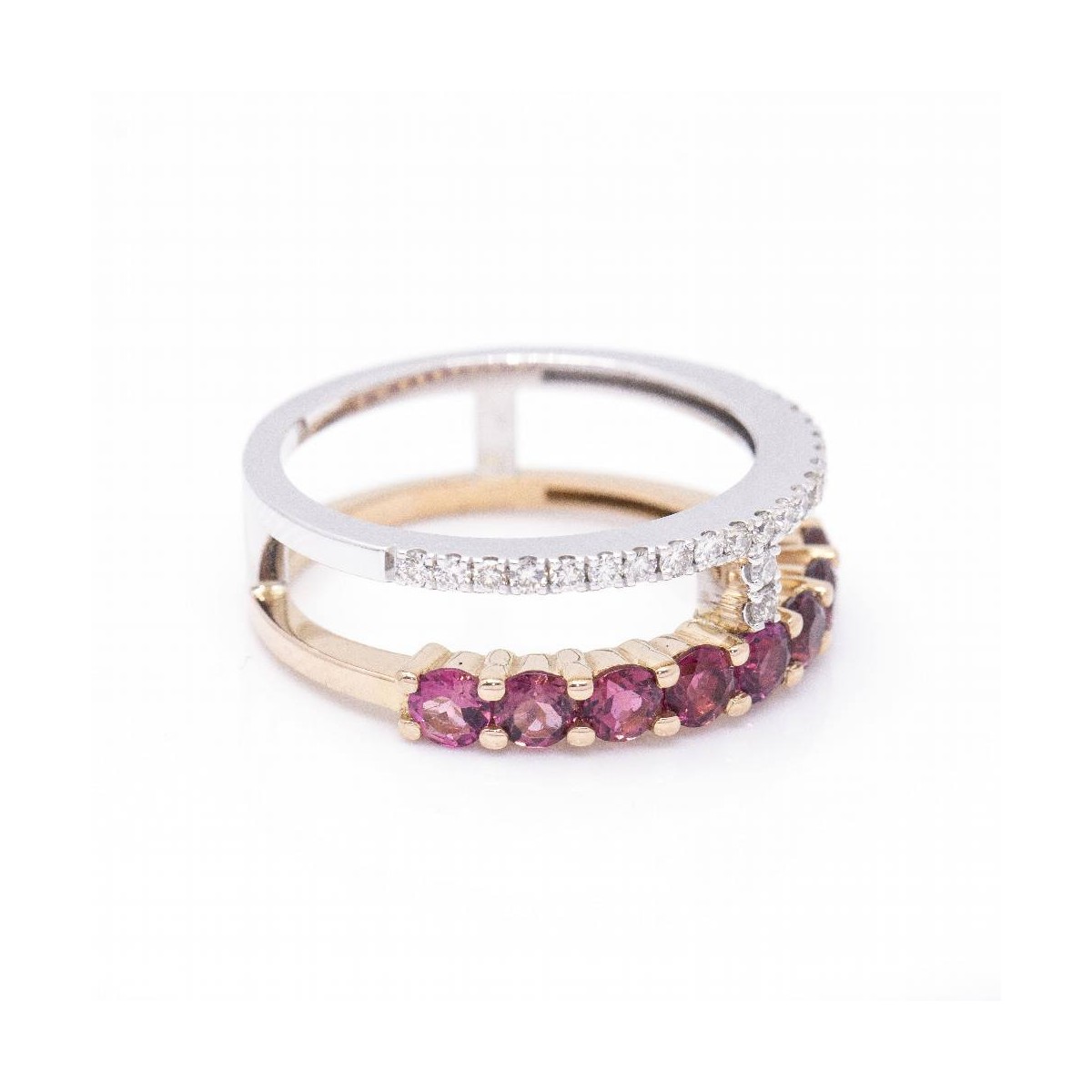 Anillo de Oro bicolor para mujer | 23 x Diamantes en talla Brillante con peso total de 0,18cts en calidad H/VS y 9x Turmalinas rosas de 3mm l Talla 12,5 este anillo se puede modificar de tamaño, consultar presupuesto | Oro Rosa y Oro Blanco de 18 kt. | 5,17 gramos | Medidas: Ancho 17mm | Articulo nuevo a estrenar solo disponible en la web .