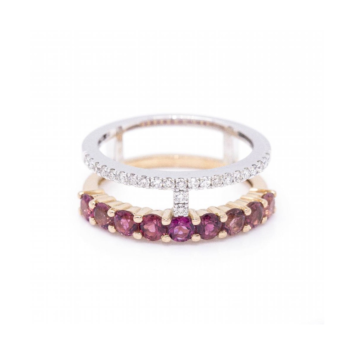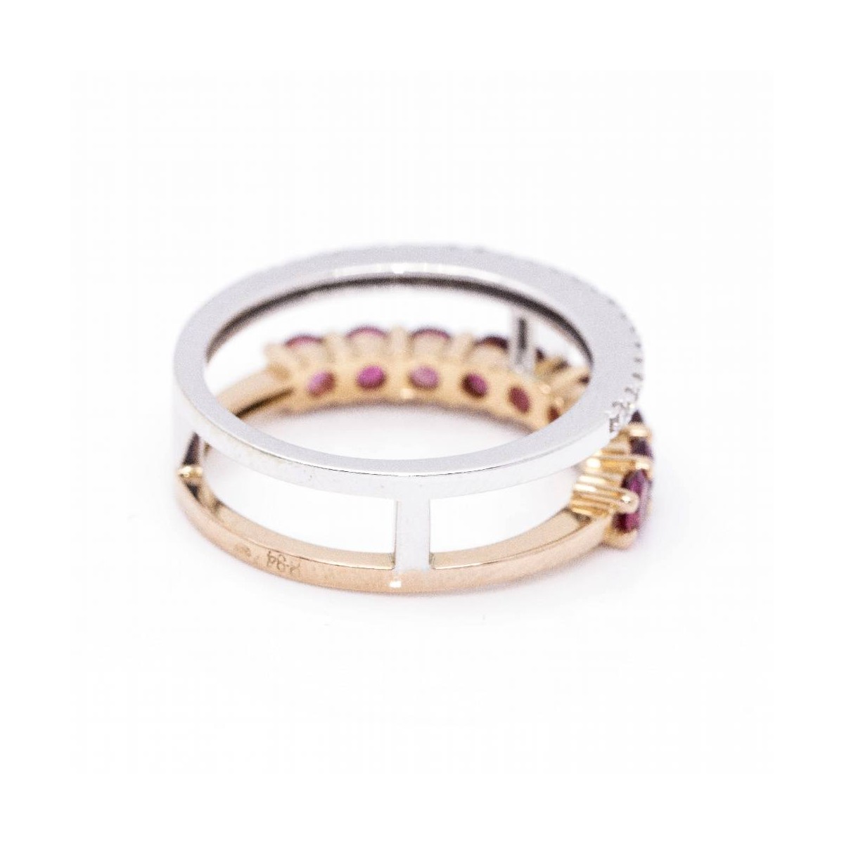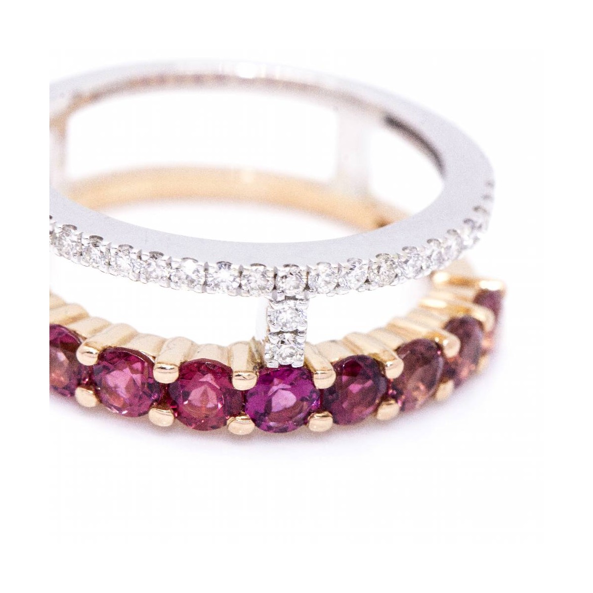 Anillo de Oro bicolor para mujer | 23 x Diamantes en talla Brillante con peso total de 0,18cts en calidad H/VS y 9x Turmalinas rosas de 3mm l Talla 12,5 este anillo se puede modificar de tamaño, consultar presupuesto | Oro Rosa y Oro Blanco de 18 kt. | 5,17 gramos | Medidas: Ancho 17mm | Articulo nuevo a estrenar solo disponible en la web .