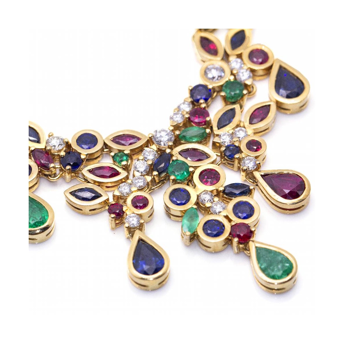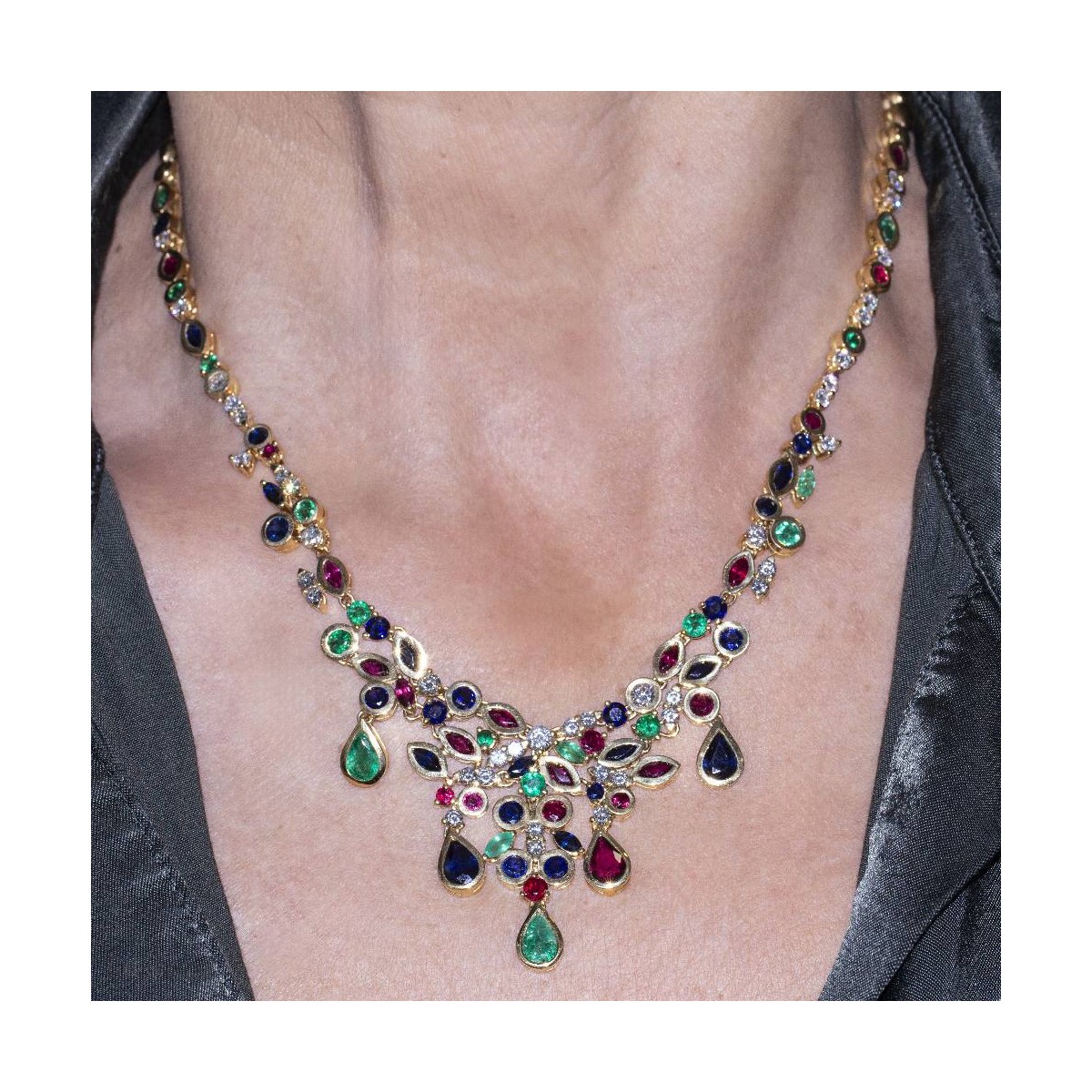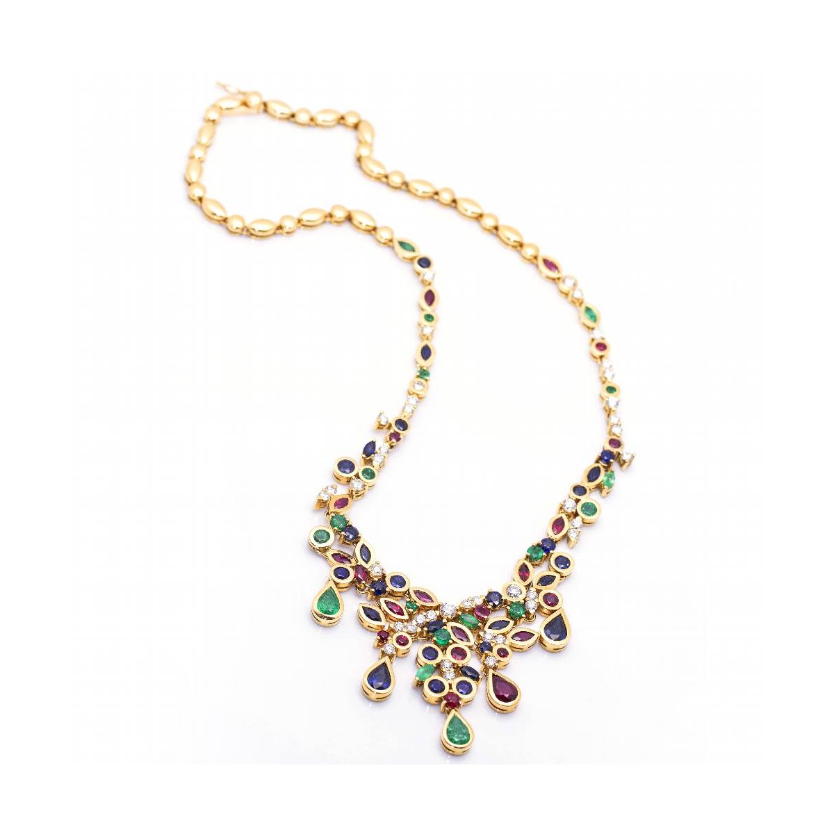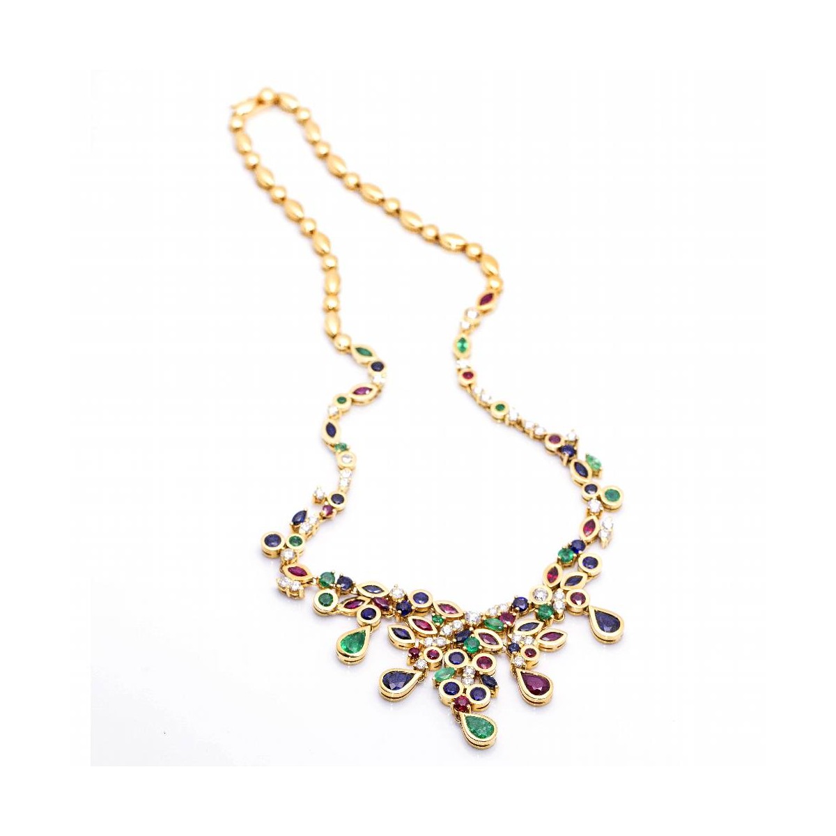 Collar de Oro Amarillo y 20 quilates de piedras preciosas para mujer | 40x Diamantes en talla Brillante con peso total 3,50ct en calidad G/Vs | 18x Esmeraldas con peso total de 3,98cts. | 20x Rubis con peso total de 5,51cts | 23x Zafiros con peso total de 6,95cts. | Oro Amarillo 18 kt. | 68,40 gramos. | Cierre cajón | Medidas: 44cm de longitud | Este artículo se encuentra en perfecto estado de conservación, solo disponible en la Web | Ref : UKD364207LF