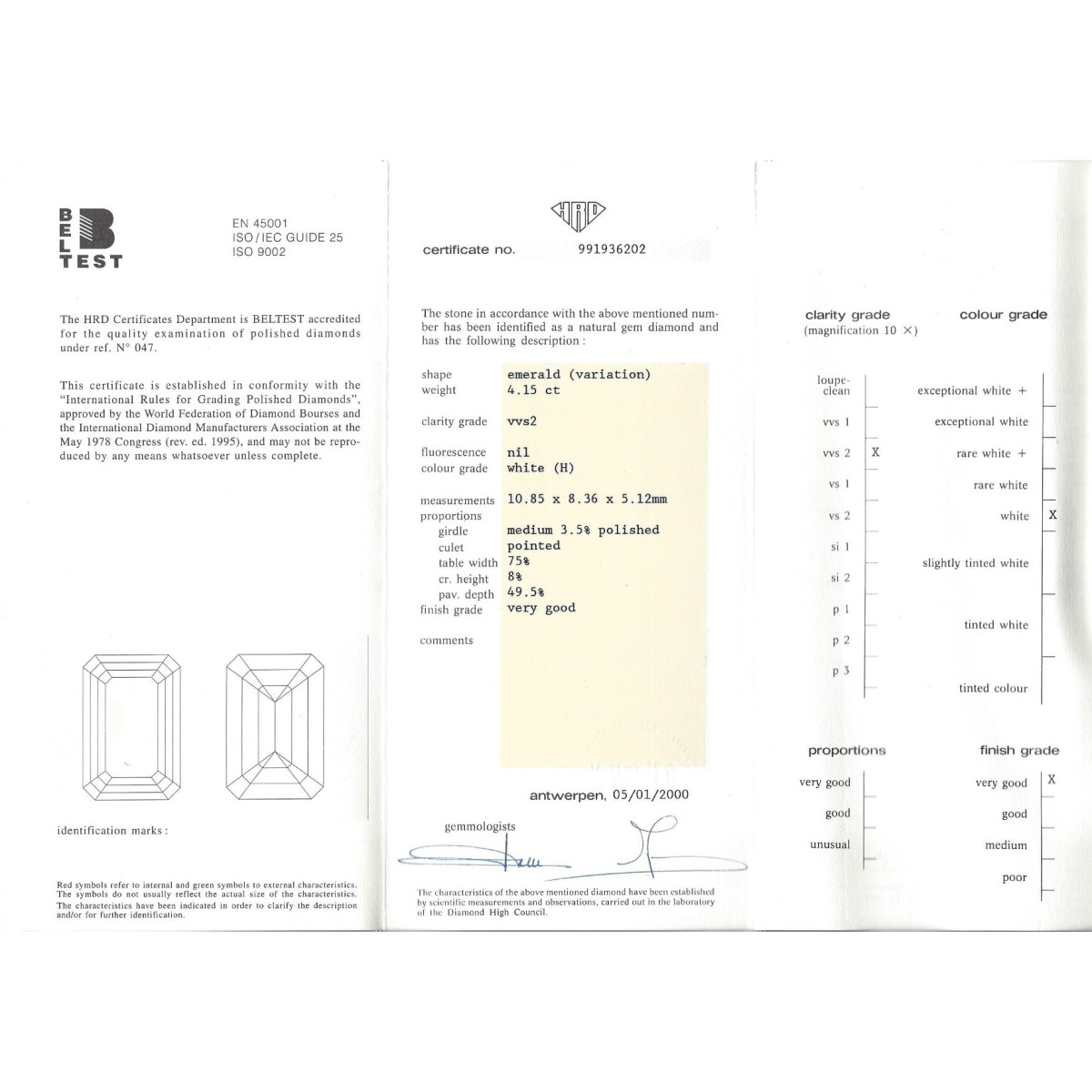 Diamante en Talla Esmeralda con Certificado HRD Nr.991936202 | Peso: 4,15ct | Color: H Pureza: VVS2 | Proporciones: Very Good | Sin Fluorescencia | Producto nuevo a estrenar solo disponible en la web. Este articulo no permite pago a plazos
