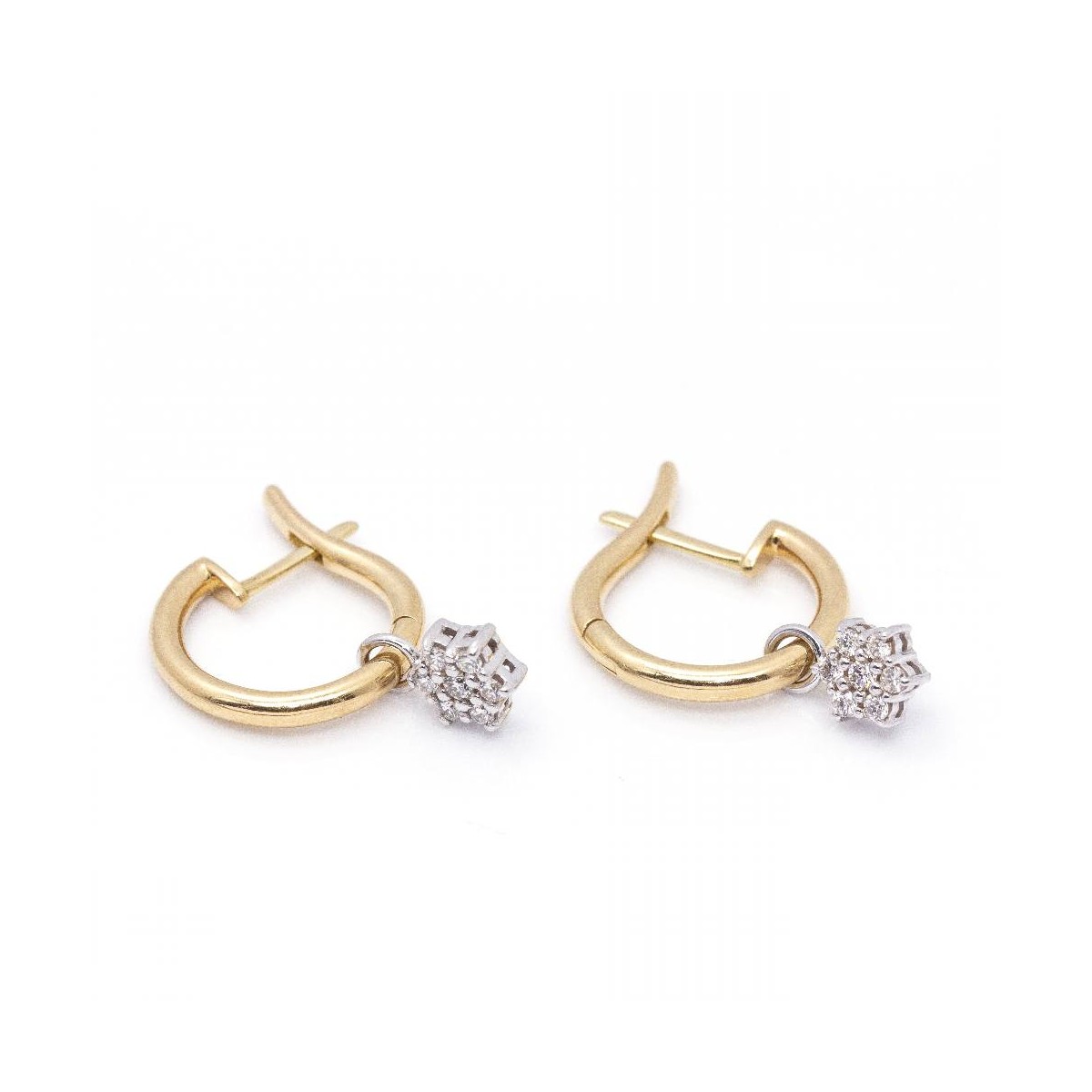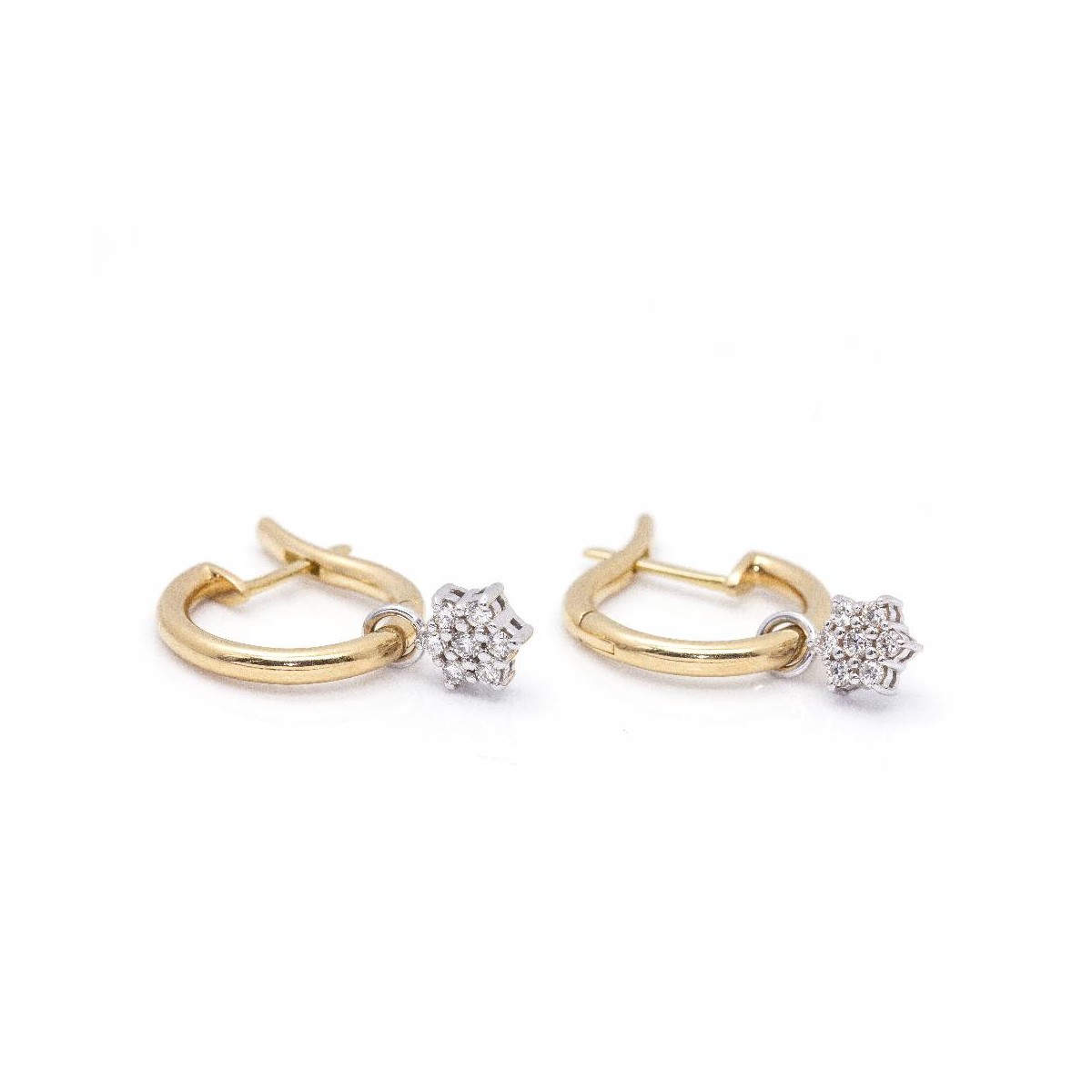 Pendientes en Oro bicolor para mujer | Estos pendientes permiten retirar la flor de Diamantes y llevarlos como aretes | 14x Diamantes en talla Brillante con peso total aprox. 0,18ct en calidad H/VS | Cierre catalán | Oro Amarillo y Oro Blanco 18 kt | 4,84 gramos. | Medidas: Largo 20mm, sin flor miden 13mm | Producto nuevo a estrenar solo disponible en la web.Ref :UKD360078AS